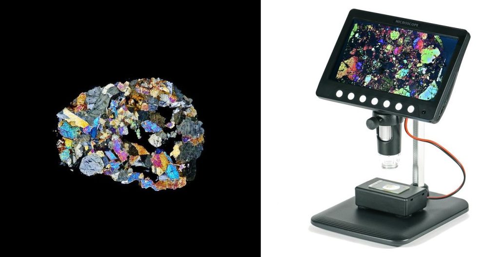 Olyannyira gazdag, hogy a szokásos színes-halus kulisszák mellett tudományos dolgokat is nézhetünk majd. Ott lesz ugyanis a mostanában egyre több bulin hasonló programmal feltűnő Vörös Ádám csillagász is, Marsról származó csiszolattal, holdi meteorittal, a Vesta kisbolygó darabjával, meteordarabbal az elhíresült 2013-as oroszországi becsapódásból, líbiai sárga sivatagi üveggel, zöld moldavittal (meteorbecsapódáskor keletkező anyag), továbbá csiszolt és nyers meteoritmedálokkal. Ádám nem sajnálja az érintést űrből hullott köveitől, szóval mindent meg lehet tapogatni majd, és hoz mikroszkópot (lásd a képen) is. A csillagászos program része még 2025 legszebb magyar asztrofotóinak újranyomtatott verzióinak (az eredetiek a Természettudományi Múzeumban vannak kiállítva) megmutatása is.