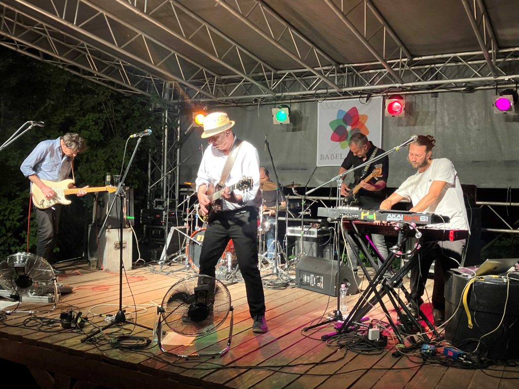 Még soha nem voltam Balatonbogláron a Babel Campben, ezért dupla öröm volt, hogy ott lép fel a Kiadó, mert így azt is megnézhettem. Mint a neve is mutatja, ez tulajdonképpen egy kemping, de annak egyáltalán nem szokványos: egy régi uradalom (lehet) a helyszín, ami egyszerre művésztelep, üdülő, kemping, és nyitott közösségi tér, aminek közepén van egy akkora színpad, amin öt zenész még pont kényelmesen elfér, és aminek meglepően jó a hangosítása. Hibátlanul szólt a zenekar végig, Menyhárt Jenő, az Európa Kiadó igazgatója mindössze egyszer kért a hangmérnöktől egy kis éneket a fülébe, de azt mi úgyse halljuk, hogy ő mit hall, úgyhogy nekünk az is mindegy volt.