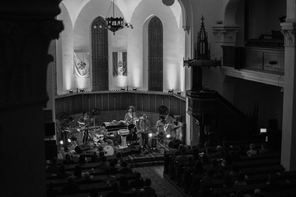 A zenekar nagyrésze Pestről indult, egyedül a hegedűsünk esett be Bécsből, még éppen egy gyors hangbeállásra. Erre az előadásra csak lábdobot és néhány csörgőt vittünk magunkkal, hogy ne csattogjon a hang a térben, és így a közönség számára is élvezhető legyen a műsor. A helyszínen nagyon kedves fogadtatásban volt részünk. A helyi lelkész konferált fel minket, és egész sokan eljöttek, pedig aznap a 30Y mellett még számos más izgalmas esemény is volt a városban. A koncert után ráadásul maradt még arra is időnk, hogy rövid teológiai diskurzust folytassunk a lelkésszel a templomkertben.